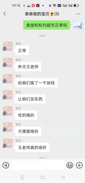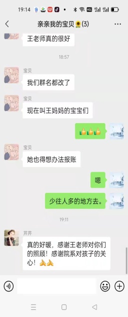 封城当天晚上,王倩老师与指导研究生的家长逐一联系,请家长们放心,学生家长看到老师发的消息后,感觉非常暖心,表示我们“家校联动”,疫情更能尽快解除。