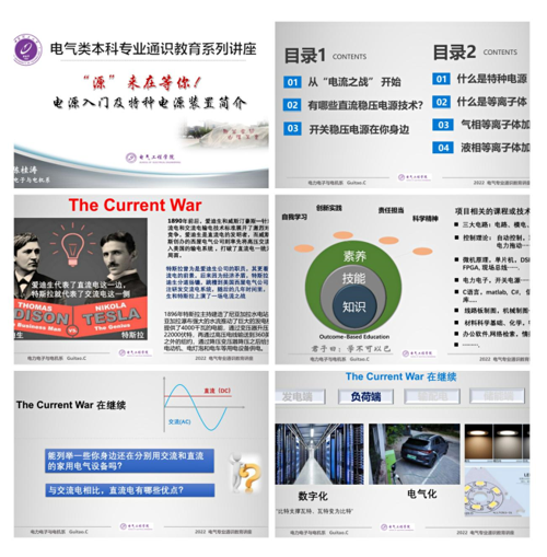 第二期讲座题为“电源入门及特种电源装置简介”。陈桂涛老师首先提出著名的“电流之战”来引入开关电源知识,并展开特种电源的详细讲解,报告过程包含大量电力电子技术、电路、开关电源、模拟电子技术等学科的知识,全面地概述了开关电源这门综合学科,为本科学生的专业学习引领方向。