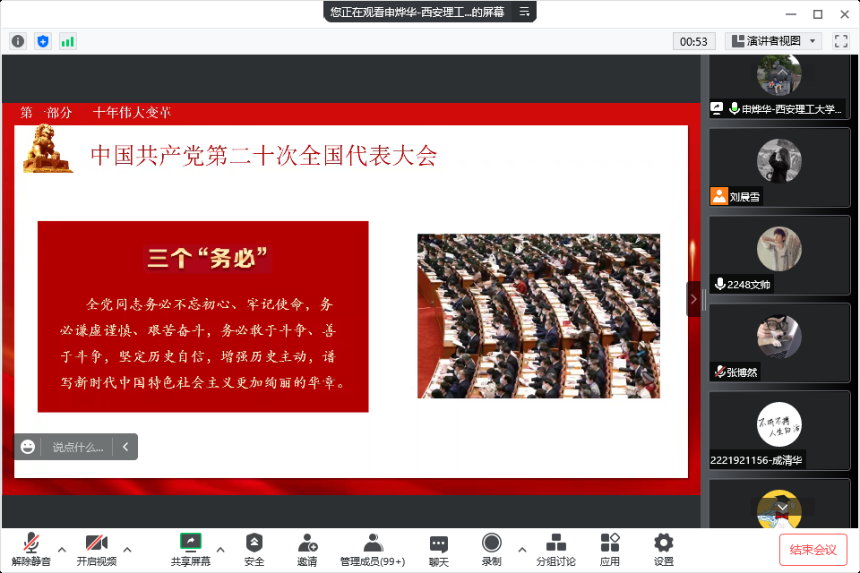申烨华以详实的数据、丰富的事例,结合时代特征和学生特点,从党和国家过去五年工作和新时代十年的伟大变革、马克思主义中国化时代化、坚持党的全面领导和全面从严治党等方面,对党的二十大精神进行了系统宣讲和深刻解读,并为同学们梳理、讲解了二十大报告中擘画的新时代中国特色社会主义宏伟蓝图。带领学生认识和把握党的二十大的重大意义,有效推动了党的二十大精神入脑入心。