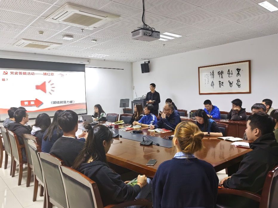 活动比赛题目由经典红歌、历史事件图片组成,共设20道题,答对加一分,答错不计分;参与人员分为五组,分别进行抢答,答对一题加一分,答错不加分。最后,第五组和第三组分别获得第一名和第二名,党支部为前两名准备了精美小礼物。党的百年党史蕴含着丰富的精神瑰宝,我们通过红歌猜猜猜和看图猜历史的答题形式感悟党史,让大家仿佛置身于历史的长河中——从硝烟弥漫的战争岁月、建设祖国的奋斗岁月,再到现如今国泰民安的激情岁月,进而感受到我们的祖国正走在繁荣富强的康庄大道上,唤醒我们内心深处的红色基因,并将其继续传承。