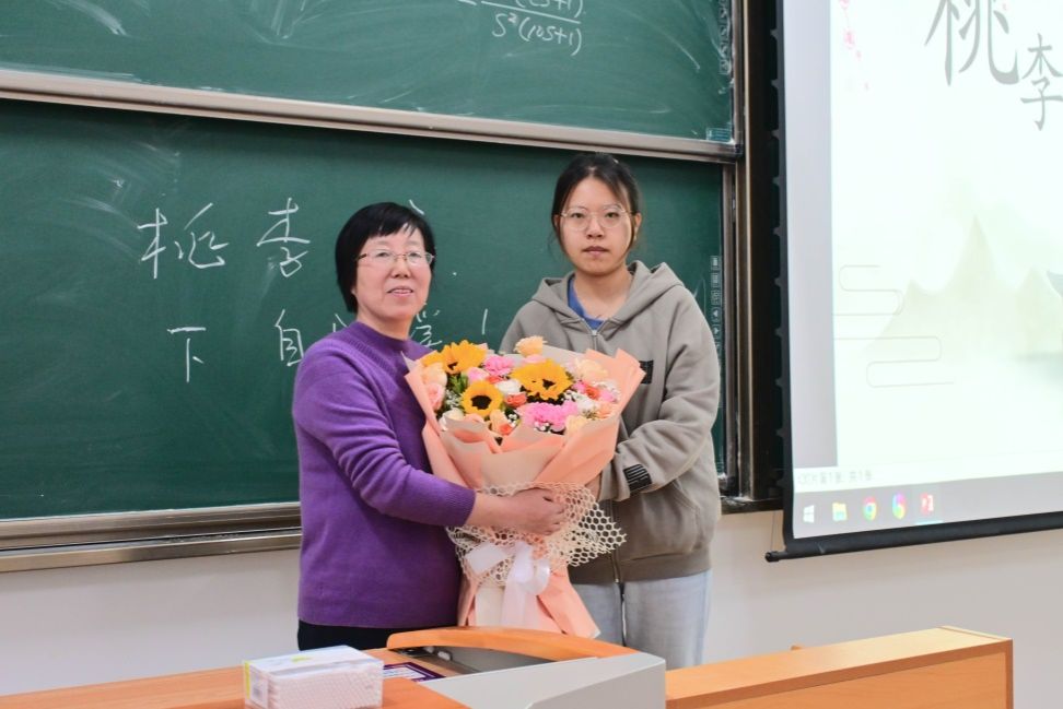 仪式由贾嵘院长主持。首先,王德意教授发言,他用四句话来概括杨晓萍老师的从教经历:“扎根西理三十载,呕心沥血育英才,一支粉笔写大爱,三尺讲台铸伟业”,王老师回忆起学生对杨老师的尊敬爱戴,亲切称其为“杨妈妈”。接着,姚李孝教授现场板书,用“桃李不言、下自成蹊”八个字凝练了杨老师的教书生涯,高度赞扬了杨老师对教书育人工作始终兢兢业业、一丝不苟的态度。