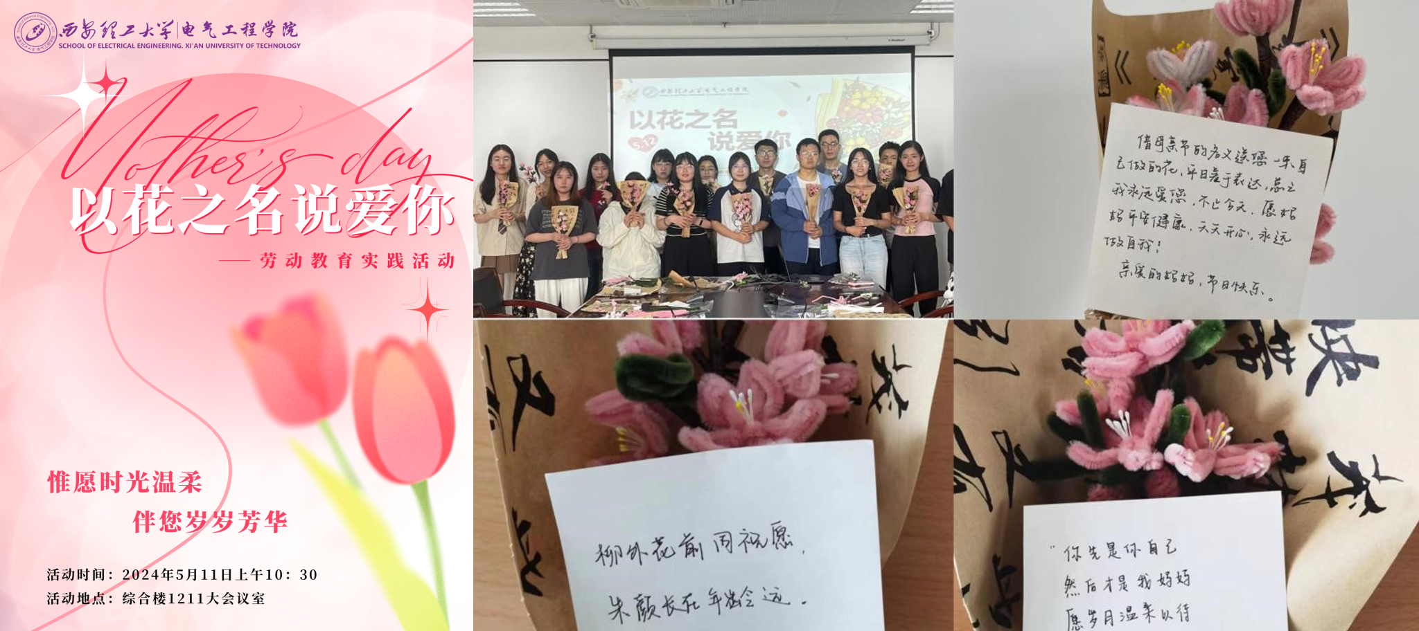 活动现场,涂晓凤向参与活动的学生介绍了母亲节的由来,发放制作花束的材料,讲解并示范手工花朵制作、裁剪、固定的步骤,参与学生通过扭、剪、粘等步骤,一丝不苟、力求完美,具备观赏性、独特性、艺术性的手工花展现在大家眼前,最后,学生写下对母亲的真挚祝福和感恩寄语。
