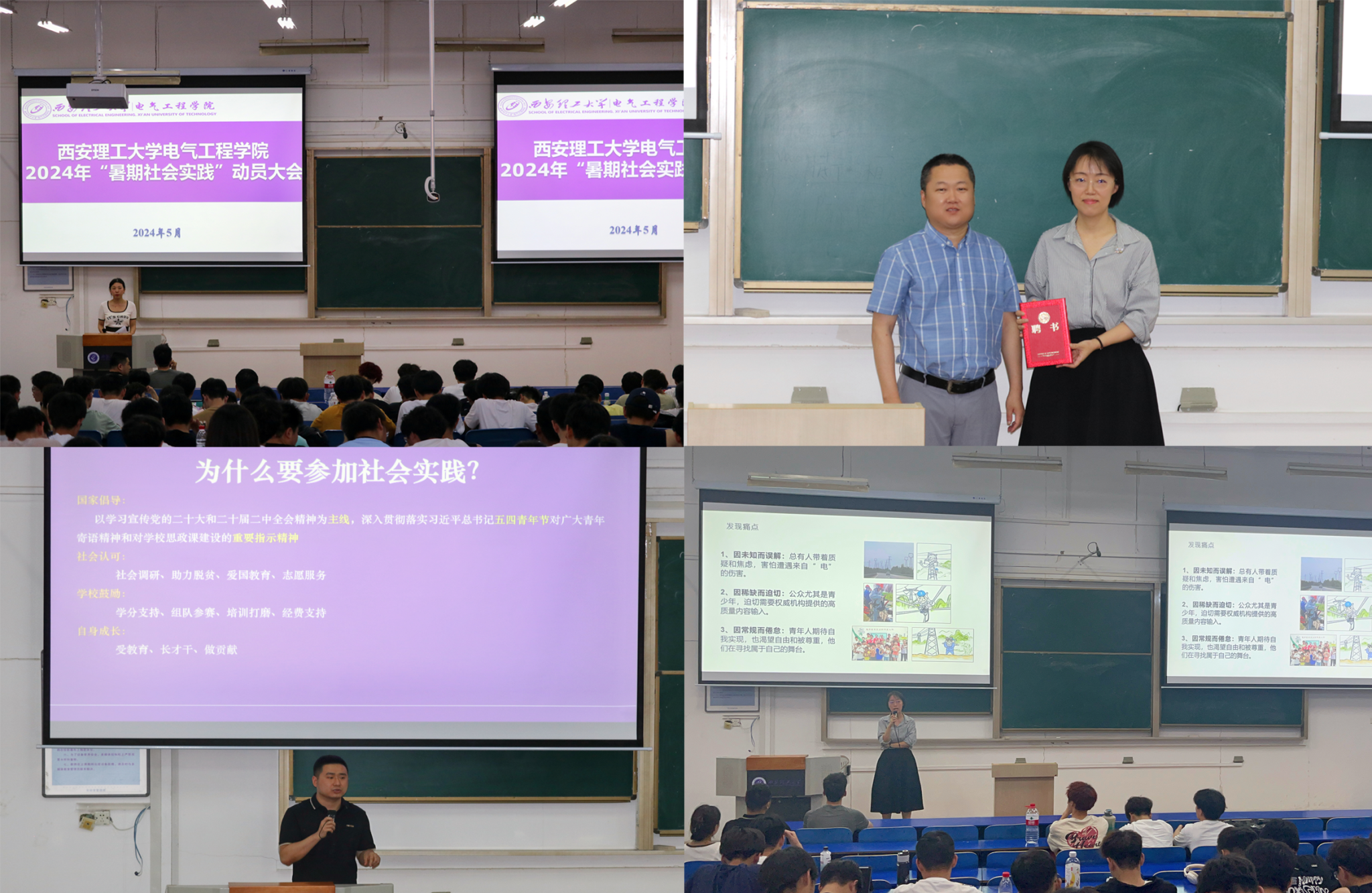 为贯彻落实习近平总书记五四青年节对广大青年寄语精神和对学校思政课建设的重要指示精神,充分发挥社会实践活动在深化和加强大学生思想政治教育中的育人作用,我院于5月23日在教8-601教室召开了“2024年暑期社会实践动员会”。国家电网公司优秀专家人才张婷、党委副书记兼副院长何海生、团委书记刘骊、2022级本科生辅导员及全体2022级本科生参会,大会由许红主持。