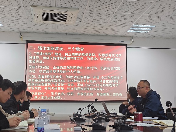 会上,方筱滨首先就基层党支部委员会的分工和职责进行详细讲解,指出明确各成员职责是提高工作效率、确保党支部正常运作的基础。高性能硕博党支部书记张园洁分别从明确职责,提升自身、加强支部组织建设、强化党员教育管理、注重创新工作四个方面进行经验分享;博士生党支部书记陶佳鑫分享支部在“科研+党建”全面发展的特色党建工作中取得的创新实践成果,为如何建设“科研-实践-服务“三位一体的党建品牌为其他支部提供了借鉴经验。王海生对研究生导学支部的品牌、组织、纪律建设提出了若干建设性建议,并勉励各支部委员要勇于承担责任以更好的发挥支委会职能。