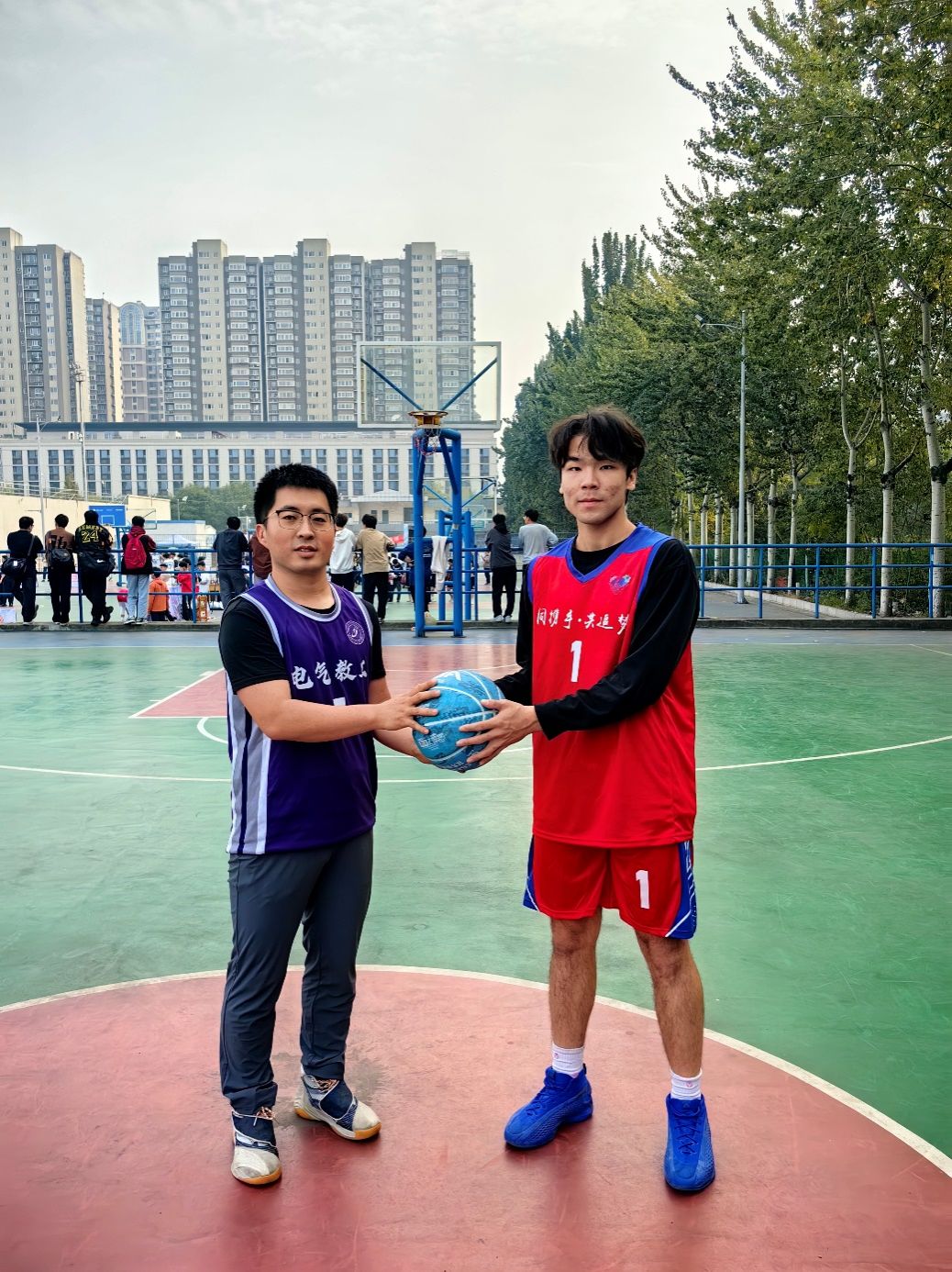 赛后,电气工程学院教职工队向民族生队赠送了礼物-篮球。