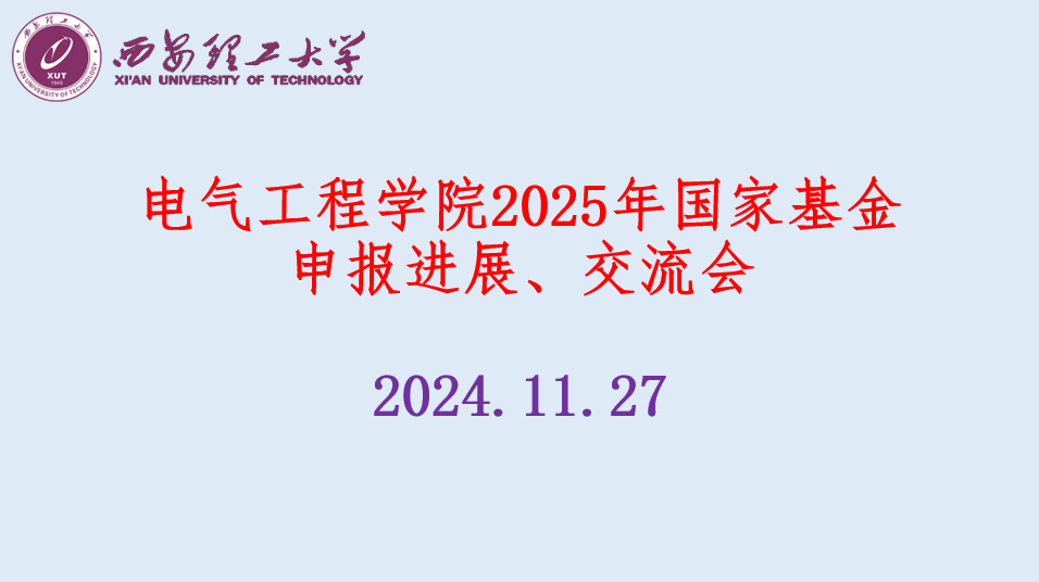 为进一步推动2025年国家自然科学基金申报工作,提升申报质量,电气工程学院于11月27日在综合楼1211会议室召开了2025年国家自然科学基金申报进展汇报与交流会。学院领导及45岁以下中青年教师参加了此次会议。会议由科研副院长段建东教授主持,院长贾嵘教授出席并致辞。