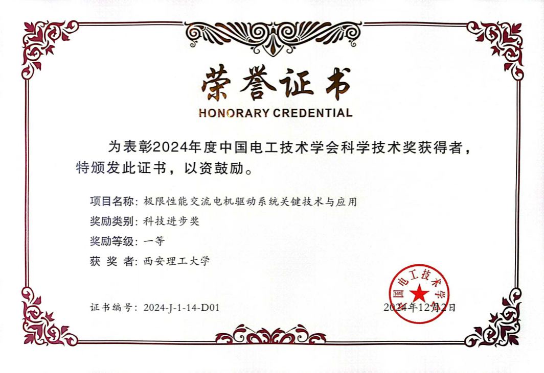 其中,电气工程学院尹忠刚教授主持的《极限性能交流电机驱动系统关键技术与应用》项目荣获2024年度中国电工技术学会科学技术奖一等奖。