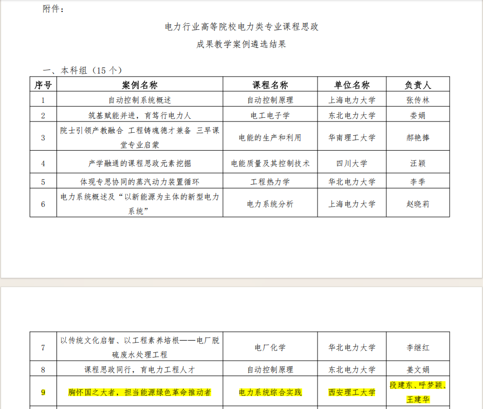 电力行业高等院校电力类专业课程思政成果教学案例征集与推广活动由中国电力教育协会组织,旨在持续推进课程思政教学改革创新,切实提升电力行业技术技能人才培养质量,培养造就大批德才兼备的高素质人才。此次共有104个课程思政教学案例参与遴选,经过专家评审,15个本科组成果案例被遴选为优秀教学案例。