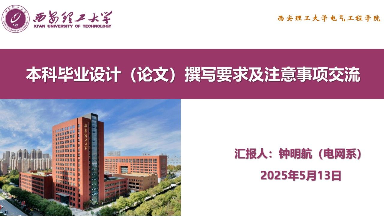 2025年5月13日上午,我院举办本科生毕业设计论文写作指导讲座,特邀智能电网与控制工程系钟明航老师作专题报告,讲座围绕“科学规划、规范写作、从容答辩”三大主题展开。