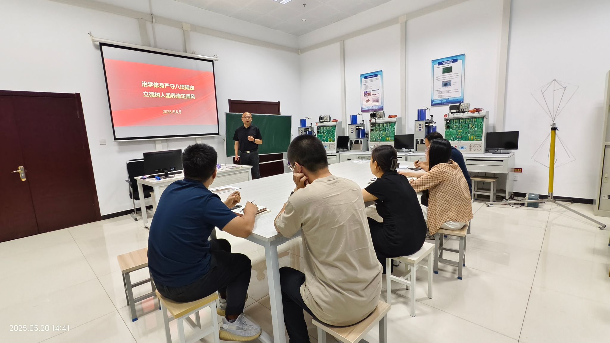 为进一步强化纪律作风建设,推动中央八项规定精神在教育教学工作中落地生根,2025年5月20日,电气工程学院实验中心党支部组织全体教职工开展主题党日活动。本次活动通过专题党课、文件研学、案例警示等多种形式,系统学习中央八项规定精神及相关要求,着力锤炼新时代师德师风,营造风清气正的校园生态。