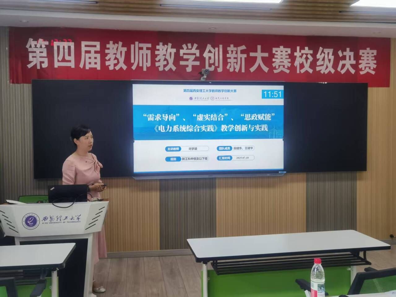 本次大赛竞争激烈,汇聚了学校众多优秀教师同台竞技。电气学院的参赛课程《电力系统综合实践》紧密围绕新工科建设与国家能源战略需求,对实践教学模式进行了系统性、前瞻性的创新改革。呼老师及其课程团队深度融合虚拟仿真、项目驱动等先进理念与技术,从课程内容、教学方法、考核评价方面进行改革,构建了“理论-实践-创新”一体化的教学新范式,有效激发了学生的学习潜能与实践创新能力,其突出的教学成效和鲜明的创新特色获得了评委们的高度赞誉。