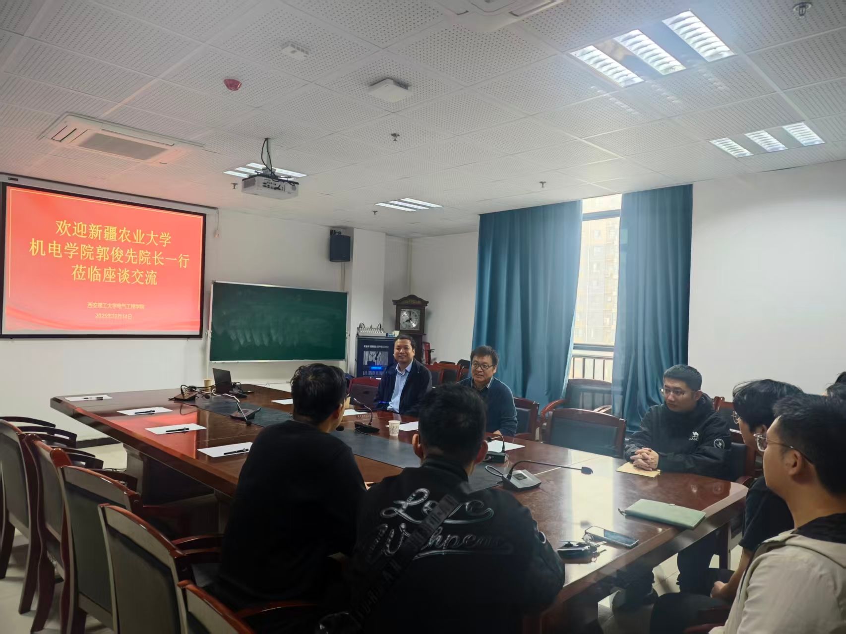 为加强学院(学科)交流合作,深化高层次人才培养与引进,助力“双一流”建设,2025年10月14日上午,新疆农业大学机电工程学院(新能源学院)院长郭俊先一行到访电气工程学院,就学科专业建设科研合作博士人才培养与引进开展调研交流。电气工程学院院长贾嵘、副院长宋卫章和来宾进行座谈。