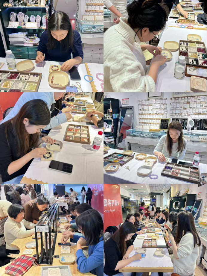 活动现场精心甄选白水晶、粉水晶、墨晶等多种天然水晶珠,搭配温润细腻的和田玉配件,每一件物料都兼具天然质感与美学价值,承载着千年非遗工艺的底蕴与美好期许。专业手作指导老师全程值守,细致讲解晶玉的文化寓意、挑选技巧及手串编制方法,从串珠、搭配到打结收尾,耐心指导每一个步骤,确保手作新手也能轻松完成专属作品。