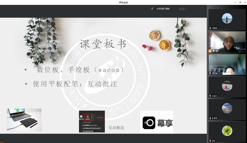 随后,梁栋老师针对线上课堂中可能存在的障碍为切入点,提出线上教学面临的两个主要问题。一是线上教学中的互动局限,二是线上教学板书书写不便。针对上述问题,梁老师为大家分享了自己的解决方案,即通过课堂弹幕、互动板书、智能分组、阶梯教室等方式提高师生课堂互动性,利用书写板、互动板书、“幕享”软件等实现线上教学板书的便利书写。