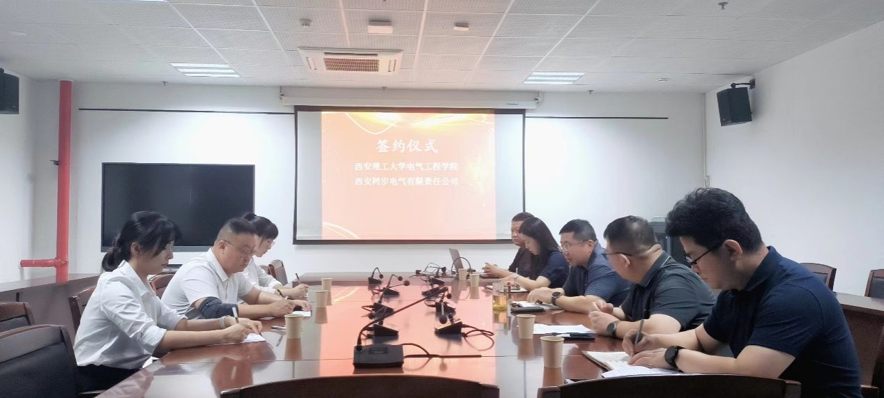 为面向国家电力能源安全战略建设发展需求,扎实推进校企合作,2024年8月,西安理工大学电气工程学院与西安同步电气有限责任公司在综合楼1211会议室举行校企合作重大项目签约仪式。校科技处新质生产力创新中心副主任王锵、电气工程学院院长贾嵘教授、西安同步电气公司董事长伊仁图太、西安理工大学下属西安智通自动化技术开发有限公司法人代表张兴华、电气工程学院项目负责人王建渊老师出席了本次签约仪式与座谈会,会议由王建渊老师主持。